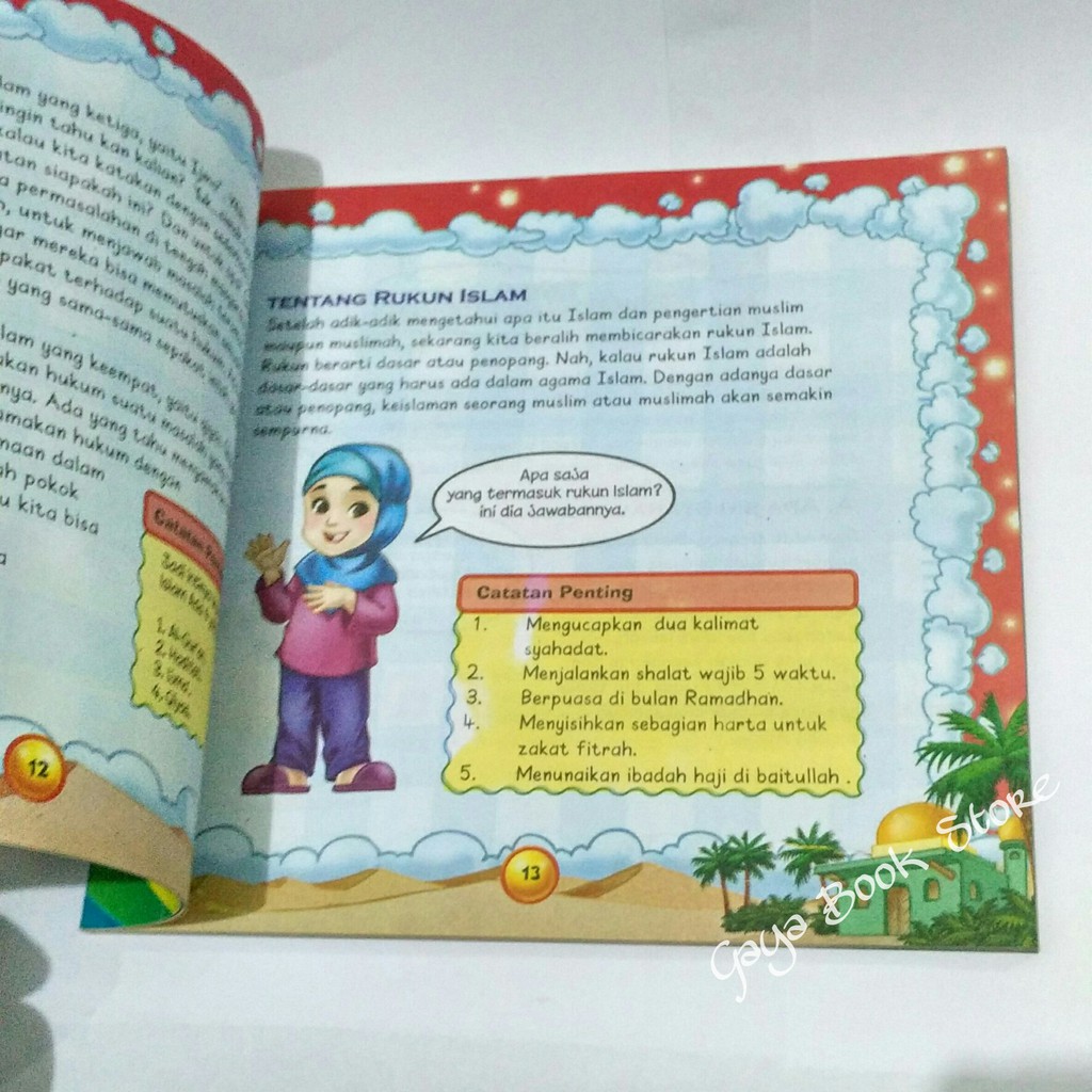 Dimana rukun islam terdiri dari mengucapkan dua kalimat syahadat, melaksanakan sholat lima waktu sehari semalam, berpuasa di bulan ramadhan , zakat fitrah, dan menunaikan ibadah haji bagi yang mampu.